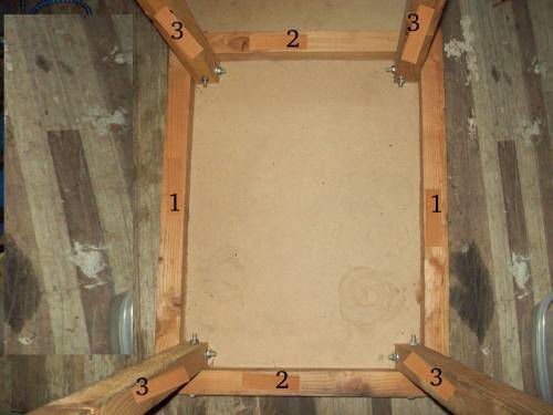 The construction in the photo below is of 1½” X 1½” fir. The pieces marked “1” in the photo are 22”. The pieces marked “2” are 14”. The 14-inch pieces fit inside the 22-inch pieces, making the width 17 inches (14 + 3). The legs (marked “3” in the photo) are 22”.