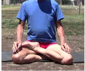 Warning: Both lotus and half-lotus positions are to be attained very gradually. Do not proceed against pain in the knees. If you force yourself into these positions against pain, it can damage your knees. Go slowly -- a little more each day -- no hurry. If one or both knees hurt, let the postures go and just use easy pose -- either cross-legged or sitting on the heels. (When I sit on my heels, the feet are making a V-shape, but I have short legs, and my feet are slightly pigeon-toed.)