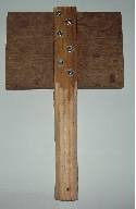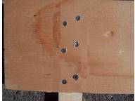Caution: This paddle, if used with anything like a one/week frequency, will basically meat-tenderize your behind. In that condition you will need a much lighter paddle for ordinary spanking. You can easily make one by cutting an 8-inch by 5¼ piece of half-inch (actually 0.455) plywood (3/8 is too light), mounting an 11½-inch by 1-and-7/16 by 3/4-inch stick of wood on it (these are probably sold as 1 X 2’s), and affixing with six 1-inch wedge-head woodscrews. Drill 5/64-inch, and countersink by touching the drill-holes with a 9/32 - inch bit. Use white glue. The screws will clamp it. See illustrations below.